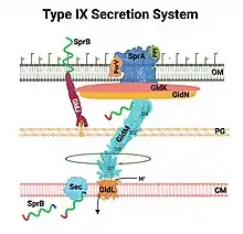 Type IX secretion systems (T9SS) are found regularly in the Fibrobacteres-Chlorobi-Bacteroidetes lineage of bacteria, where member species include an outer membrane. The system is involved variably in one type of gliding motility, in the proper targeting of certain virulence factors to the cell surface, and the degradation of complex of biopolymers.[35] T9SS has also been known as Por (porphyrin accumulation on the cell surface) secretion,[4] after the oral pathogen Porphyromonas gingivalis. At least sixteen structural components of the system have been described, including PorU, a protein-sorting transpeptidase that removes the C-terminal sorting signal from cargo proteins and mediates their attachment instead to lipopolysaccharide.