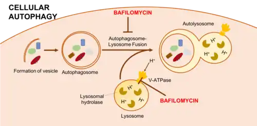 Bafilomycin A1 is most known for its use as an autophagy inhibitor.[12][18] Autophagy is the process by which the cell degrades its own organelles and some proteins through the formation of autophagosomes. Autophagosomes then fuse with lysosomes facilitating the degradation of engulfed cargo by lysosomal proteases. This process is critical in maintaining the cell's store of amino acids and other nutrients during times of nutrient deprivation or other metabolic stresses.[19] Bafilomycin interferes with this process by inhibiting the acidification of the lysosome through its interaction with V-ATPase. Lack of lysosomal acidification prevents the activity of lysosomal proteases like cathepsins so that engulfed cargo can no longer be degraded.[18]
