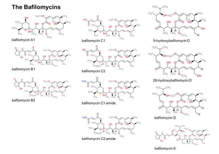 The bafilomycins are a family of macrolide antibiotics produced from a variety of Streptomycetes. Their chemical structure is defined by a 16-membered lactone ring scaffold.[2] Bafilomycins exhibit a wide range of biological activity, including anti-tumor,[3] anti-parasitic,[4][5] immunosuppressant[6] and anti-fungal[7] activity. The most used bafilomycin is bafilomycin A1, a potent inhibitor of cellular autophagy. Bafilomycins have also been found to act as ionophores, transporting potassium K+ across biological membranes and leading to mitochondrial damage and cell death.[8]