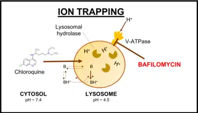 When one of these drugs is co-applied to cells with bafilomycin A1, the action of bafilomycin A1 prevents the acidification of the lysosome, therefore preventing the phenomenon of ion trapping in this compartment.[25] As the lysosome cannot acidify, lysosomotropic drugs do not become protonated and subsequently trapped in the lysosome in the presence of bafilomycin. Additionally, when cells are preloaded with lysosomotropic drugs in vitro, then treated with bafilomycin, bafilomycin acts to release the cationic compound from its accumulation in the lysosome.[17]