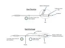 Balloon catheters used in angioplasty are either of Over-the-Wire (OTW) or Rapid Exchange (Rx) design. Rx catheters nowadays are about 90% of the Coronary Intervention market. While OTW Catheters may still be useful in highly tortuous vascular pathways, they sacrifice deflation time and pushability. When a balloon catheter is used to compress plaque within a clogged coronary artery, it is referred to as a plain old balloon angioplasty or POBA.[1] Balloon catheters are also utilized in the deployment of stents during angioplasty. Balloon catheters are supplied to the cath lab with a stent pre-mounted on the balloon. When the cardiologist inflates the balloon it expands the stent. When the cardiologist subsequently deflates the balloon, the stent stays behind in the artery and the balloon catheter can be removed. Stents that are used in conjunction with a balloon catheter are known as balloon expandable stents, as opposed to self-expandable stents, typically made of Nitinol alloy.