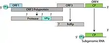 Genomes are linear, around 4kb in length. The genome has 4 open reading frames. Genomic RNA serves as both the genome and viral messenger RNA. ORF2 is a polyprotein which is possibly auto-cleaved by the ORF2 viral protease. ORF3 encodes the RNA dependent RNA polymerase and may be translated by ribosomal frameshifting as an ORF2-ORF3 polyprotein. The single capsid protein (ORF4) is translated from a subgenomic RNA.[1]