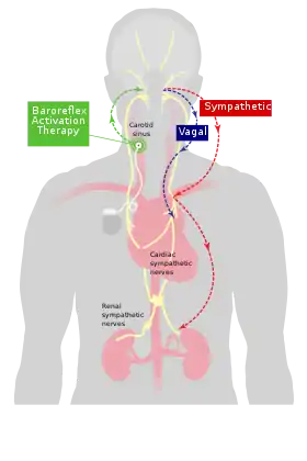 The baroreflex can be used to treat resistant hypertension.[5] This stimulation is provided by a pacemaker-like device. While the devices appears to lower blood pressure, evidence remains very limited as of 2018.[5]