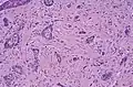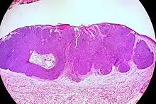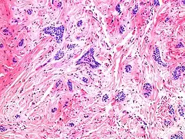 | Morpheaform basal-cell carcinoma (also known as "cicatricial basal-cell carcinoma", and "morphoeic basal-cell carcinoma") | Narrow strands and nests of basaloid cells, surrounded by dense sclerotic stroma.[29] | Aggressive[26]: 748 [27]: 647 | ![]() |