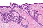 | Fibroepithelioma of Pinkus | Anastomosing epithelial strands in a fenestrated pattern[30] | Most commonly occurs on the lower back.[26]: 748 [27]: 648 | ![]() |