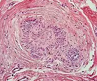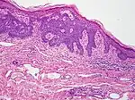 | Squamous-cell carcinoma of the skin | Squamous-cell carcinoma of the skin is generally distinguishable by for example relatively more cytoplasm, horn cyst formation and absence of palisading and cleft formations. Yet, a high prevalence means a relatively high incidence of borderline cases, such as basal-cell carcinoma with squamous cell metaplasia (H&E stain at left in image). BerEP4 staining helps in such cases, staining only basal-cell carcinoma cells (right in image). | ![]() |