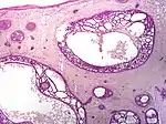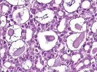 Nodular basal-cell carcinoma (also known as "classic basal-cell carcinoma") accounts for 50% of all BCC.[25] It most commonly occurs on the sun-exposed areas of the head and neck.[26]: 748 [27]: 646 Histopathology shows aggregates of basaloid cells with well-defined borders, showing a peripheral palisading of cells and one or more typical clefts.[25] Such clefts are caused by shrinkage of mucin during tissue fixation and staining.[28] Central necrosis with eosinophilic, granular features may be also present, as well as mucin. The heavy aggregates of mucin determine a cystic structure. Calcification may be also present, especially in long-standing lesions.[25] Mitotic activity is usually not so evident, but a high mitotic rate may be present in more aggressive lesions.[25] Adenoidal BCC can be classified as a variant of NBCC, characterized by basaloid cells with a reticulated configuration extending into the dermis.[25]