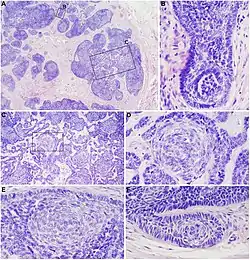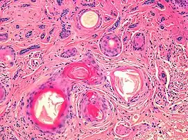 | Trichoepithelioma[notes 1] | Rims of collagen bundles, calcification, follicular/sebaceous/infundibular differentiation and cut artefacts. Cytokeratin (CK)20+, p75+, Pleckstrin homology-like domain family A member 1 + (PHLDA1+), common acute lymphoblastic leukemiaantigen + (CD10+) in tumor stroma, CK 6-, Ki-67- and Androgen Rceptor- (AR-) | ![]() |