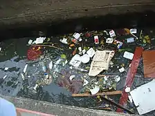 Million tons of land-based waste products such as plastics, papers, woods, and metals end up in seas, oceans, and beaches through the wind, oceans currents (five major gyres), sewage, runoff, storm-water drains and rivers.[8] Massive amount of marine debris has become a severe menace to the marine environment, aquatic life and humankind.[7] Most land-based sources are illegal dumping, landfills, and petrochemical and other industry disposals.[8] Also, other marine-based sources originate from anthropocentric marine activities that are drifted fishing lines, nets, plastic ropes or other petrochemical products from remote islands or lands, shipping vessels or fishing boats by wind and oceanic currents.[10][8][7] Marine debris source is also anthropocentric activities of local populations such as beach goers, tourists and city or town sewage.