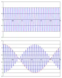 If the two original frequencies are quite close (for example, a difference of approximately twelve hertz),[4] the frequency of the cosine of the right side of the expression above, that is f1 − f2/2, is often too low to be perceived as an audible tone or pitch. Instead, it is perceived as a periodic variation in the amplitude of the first term in the expression above. It can be said that the lower frequency cosine term is an envelope for the higher frequency one, i.e. that its amplitude is modulated. The frequency of the modulation is f1 + f2/2, that is, the average of the two frequencies. It can be noted that every second burst in the modulation pattern is inverted. Each peak is replaced by a trough and vice versa. However, because the human ear is not sensitive to the phase of a sound, only its amplitude or intensity, only the magnitude of the envelope is heard. Therefore, subjectively, the frequency of the envelope seems to have twice the frequency of the modulating cosine, which means the audible beat frequency is:[5]