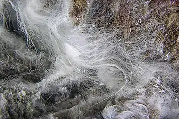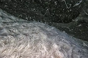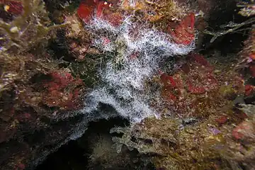 Beggiatoa can also be found in salt marshes, saline, and geothermally active underwater caves. Some studies on these environments have been carried out in the underwater caves of dolomitized limestone in Capo Palinuro, Salerno, (Italy). Here there are hydrothermal sulphidic springs and microbial biofilm is associated with the flow of hydrothermal fluids, whose activity is intermittent and starts during low tide. Mats found in the caves were composed by filaments resembling in most part Beggiatoa, Thiothrix and Flexibacter, and this Beggiatoa-like filaments were morphologically close to those found attached to rocks and the byssus of the mussels from Lucky Strike Hydrothermal vents on the Mid-Atlantic Ridge.[7]