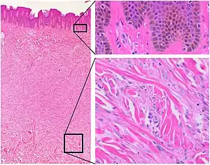| Histopathology of dermatofibroma, with basilar hyperpigmentation of the overlying epidermis (top right), and spindled fibroblasts with collagen entrapment. HE stain. | |