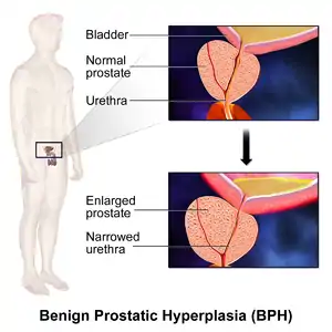 Benign prostatic hyperplasia (BPH), also called prostate enlargement, is a noncancerous increase in size of the prostate gland.[1] Symptoms may include frequent urination, trouble starting to urinate, weak stream, inability to urinate, or loss of bladder control.[1] Complications can include urinary tract infections, bladder stones, and chronic kidney problems.[2]