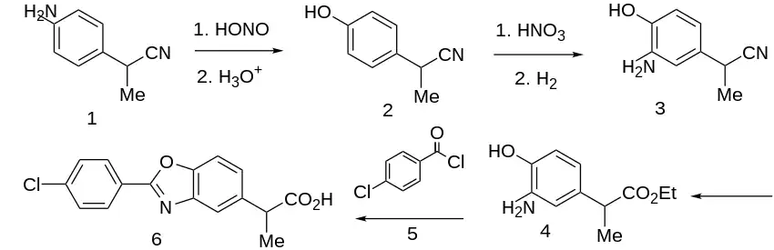 A Sandmeyer reaction by diazotisation of 2-(4-aminophenyl)propanenitrile (1) followed by acid hydrolysis leads to phenol (2), which undergoes nitration, and reduction to give aminophenol (3). Hydrolysis of the nitrile and esterification produces ester 4, which is converted to benoxaprofen (5) by acylation with p-chlorobenzoyl chloride, followed by cyclisation and then by saponification of the ethyl ester.