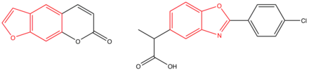 The observed skin phototoxicity of patients treated with benoxaprofen can be explained with a look at the structure of the compound. There are significant structural similarities between the benzoxazole ring of benoxaprofen and the benzofuran ring of psoralen, a compound known to be phototoxic. The free decarboxylated derivate of the drug can produce singlet oxygen and superoxide anions in the presence of oxygen. Furthermore, possible explanations for the photochemical decarboxylation and oxygen radical formation may be the accumulation of repeated dosage, the induction of cytochrome P450I, and the emergence of reactive intermediates with covalent binding. The photochemical character of the compound can cause inflammation and severe tissue damage.[4]