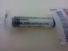 Benzathine benzylpenicillin, also known as benzathine penicillin G, is an antibiotic medication useful for the treatment of a number of bacterial infections.[3] Specifically it is used to treat strep throat, diphtheria, syphilis, and yaws.[3][4] It is also used to prevent rheumatic fever.[4] It is given by injection into a muscle.[3][4]
