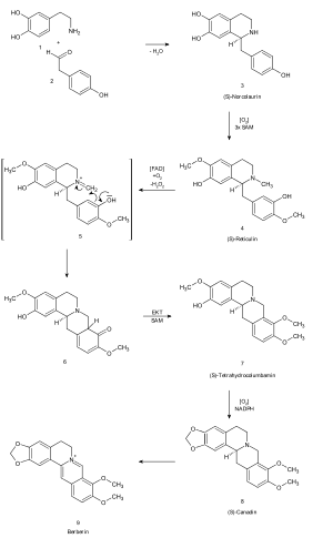 Reticuline is the immediate precursor of protoberberine alkaloids in plants.[13] Berberine is an alkaloid derived from tyrosine. L-DOPA and 4-hydroxypyruvic acid both come from L-tyrosine. Although two tyrosine molecules are used in the biosynthetic pathway, only the phenethylamine fragment of the tetrahydroisoquinoline ring system is formed via DOPA, the remaining carbon atoms come from tyrosine via 4-hydroxyphenylacetaldehyde. L-DOPA loses carbon dioxide to form dopamine 1. Likewise, 4-hydroxypyruvic acid also loses carbon dioxide to form 4-hydroxyphenylacetaldehyde 2. Dopamine 1 then reacts with 4-hydroxy-phenylacetaldehyde 2 to form (S)-norcoclaurine 3 in a reaction similar to the Mannich reaction. After oxidation and methylation by SAM, (S)-reticuline 4 is formed. (S)-reticuline serves as a pivotal intermediate to other alkaloids. Oxidation of the tertiary amine then occurs and an iminium ion is formed 5. In a Mannich-like reaction the ortho position to the phenol is nucleophilic, and electrons are pushed to form 6. Product 6 then undergoes keto–enol tautomerism to form (S)-scoulerine, which is then methylated by SAM to form (S)-tetrahydrocolumbamine 7. Product 7 is then oxidized to form the methylenedioxy ring from the ortho-methoxyphenol, via an O2-, NADPH- and cytochrome P450-dependent enzyme, giving (S)-canadine 8. (S)-canadine is then oxidized to give the quaternary isoquinolinium system of berberine. This happens in two separate oxidation steps, both requiring molecular oxygen, with H2O2 and H2O produced in the successive processes.[14]