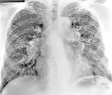 Chest radiography findings of berylliosis are non-specific. Early in the disease radiography findings are usually normal. In later stages interstitial fibrosis, pleural irregularities, hilar lymphadenopathy and ground-glass opacities have been reported.[18][19] Findings on CT are also not specific to berylliosis. Findings that are common in CT scans of people with berylliosis include parenchymal nodules in early stages. One study found that ground-glass opacities were more commonly seen on CT scan in berylliosis than in sarcoidosis. In later stages hilar lymphadenopathy, interstitial pulmonary fibrosis and pleural thickening.[19]