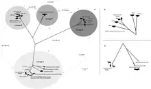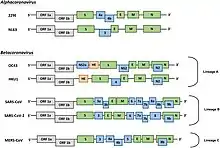 Within the genus Betacoronavirus (Group 2 CoV), four subgenera or lineages (A, B, C, and D) have traditionally been recognized.[5] The four lineages have also been named using Greek letters or numerically.[9] A fifth subgenus, Hibecovirus, was added more recently.[17] Member subgenera and species include:[18]