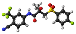 Bicalutamide, sold under the brand name Casodex among others, is an antiandrogen medication that is primarily used to treat prostate cancer.[10] It is typically used together with a gonadotropin-releasing hormone (GnRH) analogue or surgical removal of the testicles to treat metastatic prostate cancer (mPC).[11][10][12] To a lesser extent, it is used at high doses for locally advanced prostate cancer (LAPC) as a monotherapy without castration.[4][2][13] Bicalutamide was also previously used as monotherapy to treat localized prostate cancer (LPC), but authorization for this use was withdrawn following unfavorable trial findings.[13][14][15][16] Besides prostate cancer, bicalutamide is limitedly used in the treatment of excessive hair growth and scalp hair loss in women,[17][18] as a puberty blocker and component of feminizing hormone therapy for transgender girls and women,[19] to treat gonadotropin-independent early puberty in boys,[20] and to prevent overly long-lasting erections in men.[21] It is taken by mouth.[10]