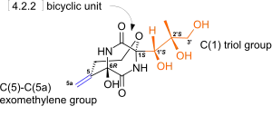 In an attempt to increase the potency and its antimicrobial spectrum, a series of synthetic and semisynthetic derivatives were investigated. Structure–activity relationship (SAR) studies have shown that the C(1) triol and the [4.2.2]-bicyclic ring were essential for bicyclomycin-rho inhibitory activity whereas the C(5)−C(5a) exomethylene moiety was not.[4] Further SAR studies[6][7] showed that 5a-substituted derivatives can be prepared that were an order of magnitude more efficient than bicyclomycin in the inhibition of rho. Bicyclomycin is considered a weak antibiotic[5] and when used alone, bicyclomycin failed to rapidly kill growing cultures of Escherichia coli; however, the additional presence of bacteriostatic concentrations of inhibitors of gene expression such as tetracycline, chloramphenicol or rifampicin led to rapid killing.[8] This lethal synergy has been considered as one way to address the growing problem of antimicrobial resistance.