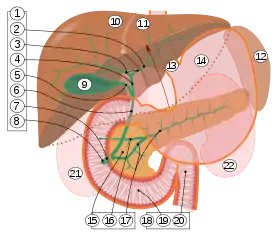 1. Bile ducts: 2. Intrahepatic bile ducts, 3. Left and right hepatic ducts, 4. Common hepatic duct, 5. Cystic duct, 6. Common bile duct, 7. Ampulla of Vater, 8. Major duodenal papilla