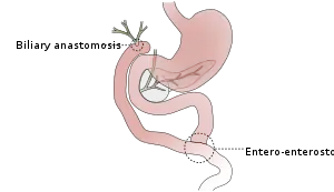 Stylised diagram of choledochojejunostomy indicating anastomoses