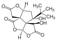 Bilobalide is important for producing several of the effects of Ginkgo biloba extracts, and it has neuroprotective effects,[3][4] as well as inducing the liver enzymes CYP3A1 and 1A2,[5] which may be partially responsible for interactions between ginkgo and other herbal medicines or pharmaceutical drugs. Bilobalide has recently been found to be a negative allosteric modulator at the GABAA and GABAA-rho receptors.[6][7] Of GABAA, it may possibly be selective for the subunits predominantly implicated in cognitive and memory functioning such as α1.