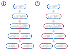 Schematic diagram of cellular growth (elongation) and binary fission of bacilli. Blue and red lines indicate old and newly generated bacterial cell wall, respectively. (1) growth at the centre of the bacterial body. e.g. Bacillus subtilis, E. coli, and others. (2) apical growth. e.g. Corynebacterium diphtheriae. This is bacterial proliferation.