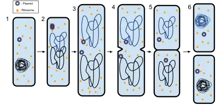 Fission, in biology, is the division of a single entity into two or more parts and the regeneration of those parts to separate entities resembling the original. The object experiencing fission is usually a cell, but the term may also refer to how organisms, bodies, populations, or species split into discrete parts.[1][2][3] The fission may be binary fission, in which a single organism produces two parts, or multiple fission, in which a single entity produces multiple parts.