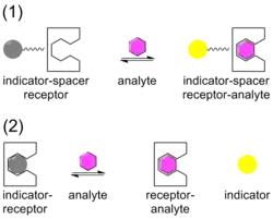 Chemical sensors,[13][14] are being developed for specific target molecules and ions in which the target (guest) form a complex with a sensor (host). The sensor is designed to be an excellent match in terms of the size and shape of the target in order to provide for the maximum binding selectivity. An indicator is associated with the sensor which undergoes a change when the target forms a complex with the sensor . The indicator change is usually a colour change (gray to yellow in the illustration) seen in absorbance or, with greater sensitivity, luminescence. The indicator may be attached to the sensor via a spacer, in the ISR arrangement, or it may be displaced from the sensor, IDA arrangement.