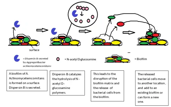 Dispersal of cells from the biofilm colony is an essential stage of the biofilm life cycle. Dispersal enables biofilms to spread and colonize new surfaces. Enzymes that degrade the biofilm extracellular matrix, such as dispersin B and deoxyribonuclease, may contribute to biofilm dispersal.[28][29] Enzymes that degrade the biofilm matrix may be useful as anti-biofilm agents.[30][31] Evidence has shown that a fatty acid messenger, cis-2-decenoic acid, is capable of inducing dispersion and inhibiting growth of biofilm colonies. Secreted by Pseudomonas aeruginosa, this compound induces cyclo heteromorphic cells in several species of bacteria and the yeast Candida albicans.[32] Nitric oxide has also been shown to trigger the dispersal of biofilms of several bacteria species[33][34] at sub-toxic concentrations. Nitric oxide has potential as a treatment for patients that have chronic infections caused by biofilms.[35]