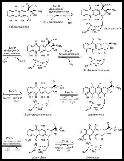 After the 21-carbon decaketide chain of DXR is completed, successive modifications are made to eventually produce a tetracyclic anthracycline aglycone (without glycoside attached).[8] The daunosamine amino sugar, activated by addition of Thiamine diphosphate (TDP), is created in another series of reactions.[9] It is joined to the anthracycline aglycone and further modifications are done to produce first daunorubicin then DXR.[10] There are at least 3 gene clusters important to DXR biosynthesis: dps genes which specify the enzymes required for the linear polyketide chain synthesis and its first cyclizations, the dnr cluster is responsible for the remaining modifications of the anthracycline structure and the dnm genes involved in the amino sugar, daunosamine, synthesis. Additionally, there is a set of "self resistance" genes to reduce the toxic impact of the anthracycline on the producing organism. One mechanism is a membrane pump that causes efflux of the DXR out of the cell (drr loci).[11] Since these complex molecules are only advantageous under specific conditions, and require a lot of energy to produce, their synthesis is tightly regulated.[12]