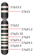 An association with the folliculin (FLCN) gene was first reported in 2002.[13] This 14-exon gene is located on the short arm of chromosome 17 (17p11.2) and has a cytosine-rich region in exon 11 particularly susceptible to mutation.[2][5] The most common mutation in this region is the insertion or deletion of a cytosine residue, found in 53% of BHD-affected families. No significant difference has been found in the symptoms experienced by families with an insertion at that location compared to those who have a deletion, but mutations in FLCN associated with BHD syndrome are heterogeneous, and are often nonsense mutations or frameshift mutations that cause early truncation of the protein product at the carboxy terminus.[14][3] Very rarely, missense mutations are observed.[6] The mutations in the FLCN gene that cause Birt–Hogg–Dubé syndrome are germline mutations, which means that they occur in every cell of the body and can be passed down to future generations.[15] These mutations are often passed from one generation to the next in an autosomal dominant fashion, but can occur as a new mutation in an individual with no prior family history (a de novo mutation).[16] The children of an affected parent each has a 50% chance of having the disease. BHD has very high penetrance.[5] A correlation between different FLCN genotypes and phenotypes has not been discovered.[16]
