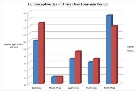 Approximately 30% of all women use birth control, although over half of all African women would use birth control if it were available.[6][7] The main problems that prevent access to and use of birth control are unavailability (especially among young people, unmarried people, and the poor), limited choice of birth control methods, side-effects or fear or side-effects, spousal disapproval or other gender-based barriers, religious concerns, and bias from healthcare providers.[7][8] There is evidence that increased use of family planning methods decreases maternal and infant mortality rates, improves quality of life for mothers, and stimulates economic development.[9][10][11][12]
