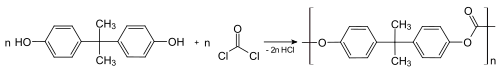 About 65–70% of all bisphenol A is used to make polycarbonate plastics,[9][10] which can consist of nearly 90% BPA by mass. Polymerisation is achieved by a reaction with phosgene, conducted under biphasic conditions; the hydrochloric acid is scavenged with aqueous base.[43] This process converts the individual molecules of BPA into large polymer chains, effectively trapping them.