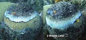 Black band disease was first observed on reefs in Belize in 1973 by A. Antonius, who described the pathogen he found infecting corals as Oscillatoria membranacea, one of the cyanobacteria.[2] The band color may be blackish brown to red depending on the vertical position of a cyanobacterial population associated with the band. The vertical position is based on a light intensity-dependent photic response of the cyanobacterial filaments, and the color (due to the cyanobacterial pigment phycoerythrin) is dependent on the thickness of the band. The band is approximately 1 millimeter (0.04 in) thick and ranges in width from 1 millimeter (0.04 in) to 7 centimeters (2.8 in) White specks may be present on surface, at times forming dense white patches. The pathogenic microbial mat moves across coral colonies at rates from 3 millimeters (0.12 in) to 1 centimeter (0.4 in) a day. Tissue death is caused by exposure to a hypoxic, sulfide-rich microenvironment associated with the base of the band.