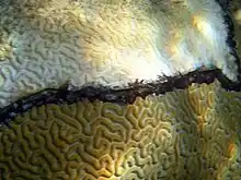 Black band disease is a coral disease in which corals develop a black band. It is characterized by complete tissue degradation due to a pathogenic microbial consortium.[1] The mat is present between apparently healthy coral tissue and freshly exposed coral skeleton.