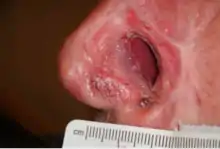 Escharotics can cause serious scarring and damage to normal skin. Their manufacture is largely unregulated, so the strength and purity of marketed products are unknown and unverified.[3] Numerous reports in the medical literature describe serious consequences of using escharotics in place of standard treatments for skin cancer, ranging from disfigurement to preventable cancer recurrences.[1][6][7][8] The website Quackwatch warned against the use of escharotics in 2008, with a collection of sourced documents compiling issues of patient injury from their use.[9] A more recent study revealed that many individuals who have used black salve were unaware of its potential dangers.[10] In 2016, the American Academy of Dermatology urged patients to consult a dermatologist before using home remedies for skin cancers.[11]