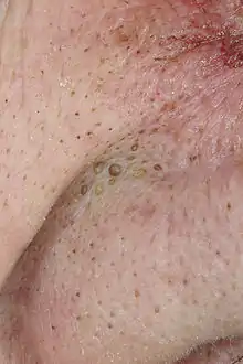 Nevus comedonicus or comedo nevus is a benign hamartoma (birthmark) of the pilosebaceous unit around the oil-producing gland in the skin.[19] It has widened open hair follicles with dark keratin plugs that resemble comedones, but they are not actually comedones.[19][20]