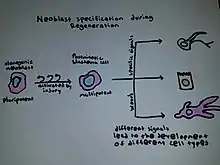 As stated above, there are several different types of organisms that can utilize a regenerative blastema as an adult. These organisms include urodele amphibians, zebrafish, and planarian flatworms as major creatures of study. In flatworms, the formation of a blastema needs adult stem cells that are called neoblasts for any type of regeneration to occur.[8] Flatworms use these undifferentiated cells for regeneration after paracrine factors can provide signals from the surface of the wound. The cells in the blastema are also referred to as clonogenic neoblasts (cNeoblasts) that are able to move to the site of the wound and reform the tissue.[9] In urodele amphibians, studies suggest that dedifferentiation of cells leads to the formation of a blastema that is able to form multiple tissue types after the amputation of their tails and wound healing occurs.[10][11] In zebrafish, and in general, it seems as if experts are still uncertain of what truly forms the blastema. However, two common theories that have often been expressed are cell dedifferentiation and the recruitment of stem cells to the wound site.[12]