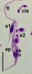 | A species of Blastocrithidia, B. papi (vertical scale bar = 10 μm).[1] | |