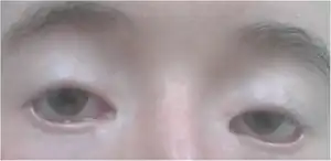 Blepharophimosis forms a part of blepharophimosis, ptosis, epicanthus inversus syndrome (BPES), also called blepharophimosis syndrome, which is an autosomal dominant condition characterised by blepharophimosis, ptosis (upper eyelid drooping), epicanthus inversus (skin folds by the nasal bridge, more prominent lower than upper lid) and telecanthus (widening of the distance between the inner corners of the eyelids). The nasal bridge is flat and there is a hypoplastic orbital rim.[1] It may also be associated with lop ears, ectropion and hypertelorism.