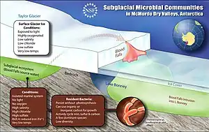 Chemical and microbial analyses both indicate that a rare subglacial ecosystem of autotrophic bacteria developed that metabolizes sulfate and ferric ions.[3][4] According to geomicrobiologist Jill Mikucki at the University of Tennessee, water samples from Blood Falls contained at least 17 different types of microbes, and almost no oxygen.[3] An explanation may be that the microbes use sulfate to respire with ferric ions and metabolize the trace levels of organic matter trapped with them. Such a metabolic process had never before been observed in nature.[3]