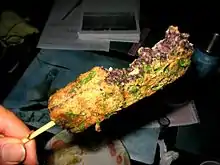 Aside from dinuguan, a native blood sausage known as pinuneg also exists among the Kankanaey people of the highlands of Luzon.[23][24] Cubes of pork blood grilled on skewers is also a common street food throughout the Philippines. These are known colloquially as "betamax" (after its resemblance to Betamax tapes).[25]