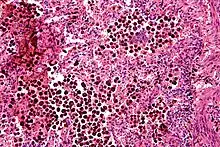 Micrograph showing abundant hemosiderin-laden alveolar macrophages (dark brown), as seen in a pulmonary hemorrhage. H&E stain.