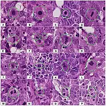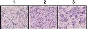 The Nottingham system[12] is recommended for breast cancer grading.[13] The Nottingham system is also called the Bloom–Richardson–Elston system (BRE),[14] or the Elston-Ellis modification[15] of the Scarff-Bloom-Richardson grading system.[16][17] It grades breast carcinomas by adding up scores for tubule formation, nuclear pleomorphism, and mitotic count, each of which is given 1 to 3 points. The scores for each of these three criteria are then added together to give an overall final score and corresponding grade. It is not applicable to medullary carcinomas which are histologically high-grade by definition, while being clinically low-grade if lymph nodes are negative.[18] It is also not applicable to metaplastic carcinomas.[19]