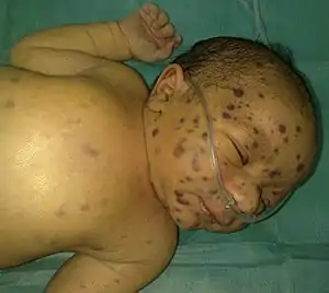 | A newborn baby with typical lesions of a blueberry muffin baby. | |