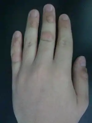 | Dermatillomania (picking of the skin) of the knuckles (via mouth), illustrating disfiguration of the distal and proximal joints of the middle and little fingers |