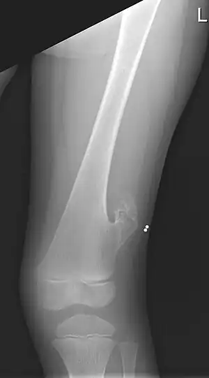 | X-ray of the left femur of a 5-year-old boy with an exostosis at the lateral side, just above the knee. | |
